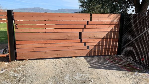 driveway gate features a sleek powder-coated steel frame combined with horizontal redwood boards, offering a modern yet warm aesthetic. The clean-lined design emphasizes simplicity and durability, making it ideal for contemporary homes. The redwood slats are evenly spaced or tightly fitted (optional), providing both privacy and airflow. The natural tones of the redwood contrast elegantly with the dark metal frame, creating a bold, architectural look.